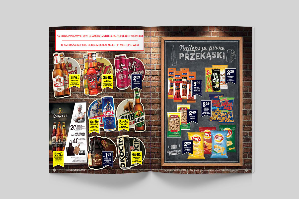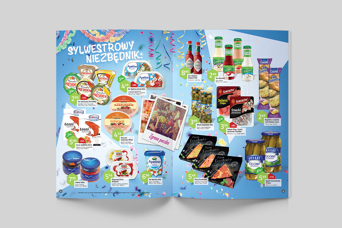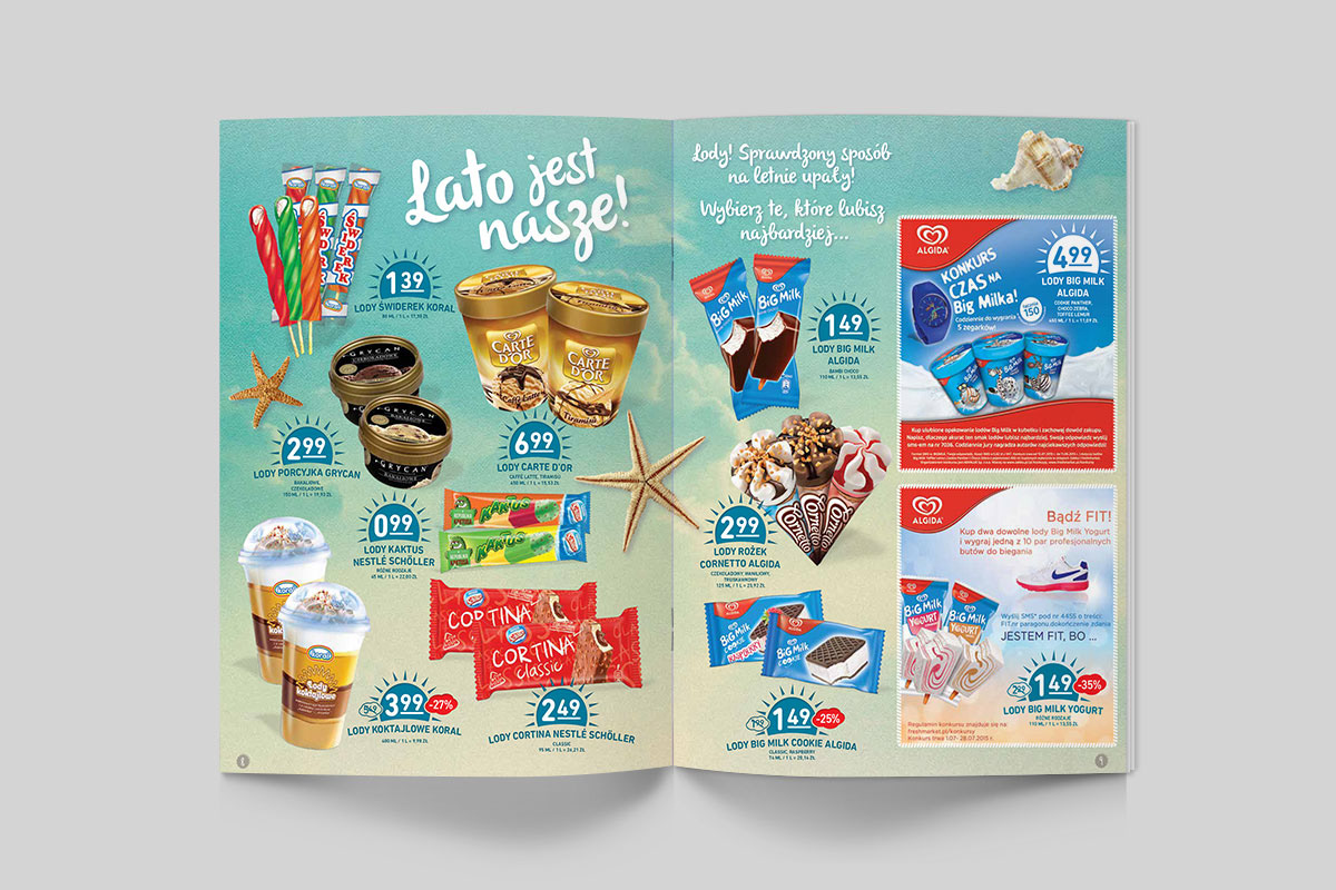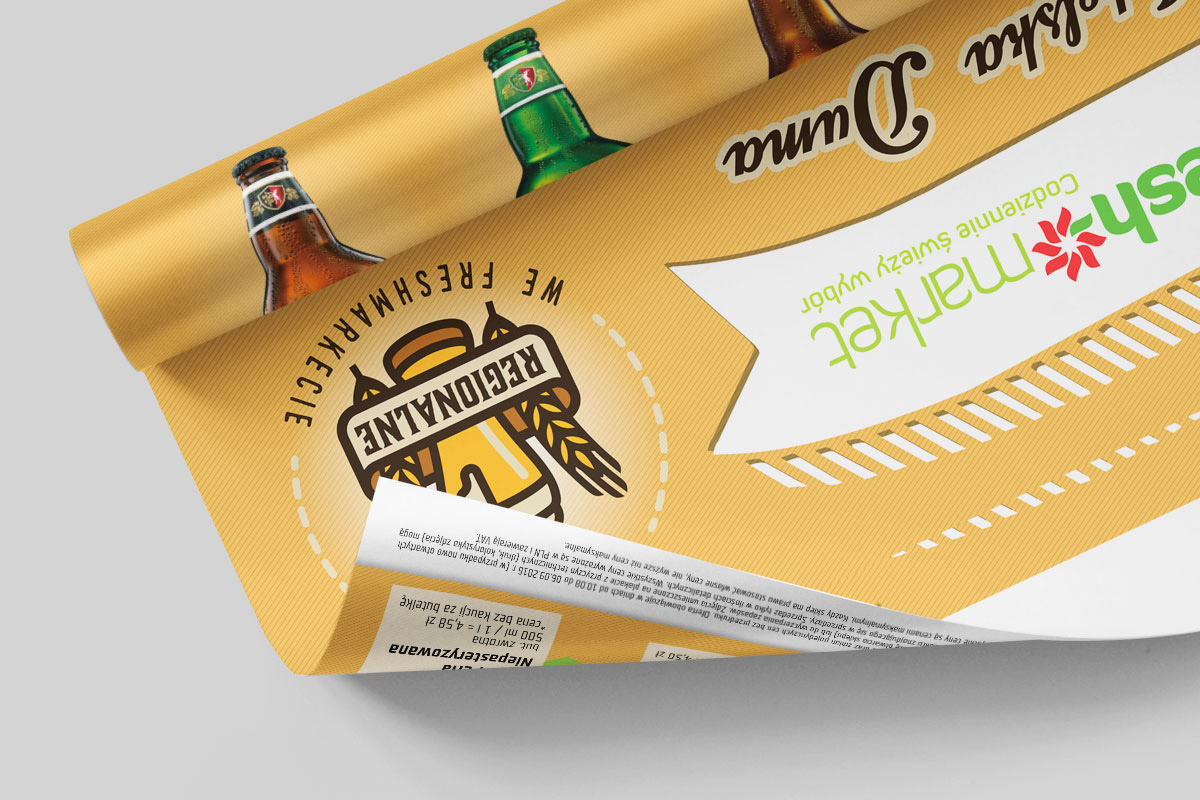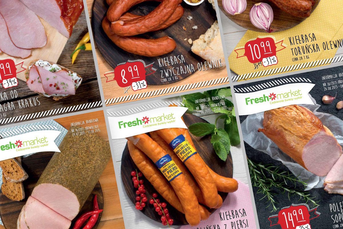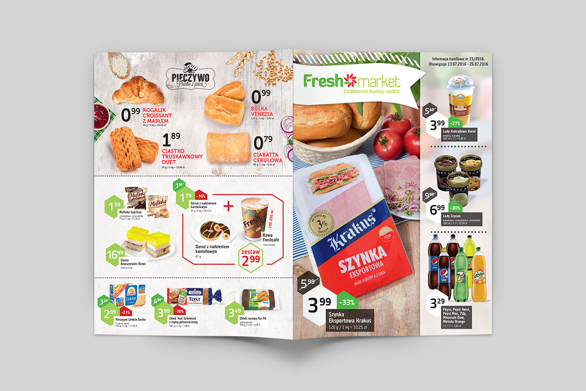 Przygotowane do druku projektów gazetek produktowych oraz plakatów dla sieci marketów spożywczych Fresh market. Praca na zlecenie agencji reklamowej H7.